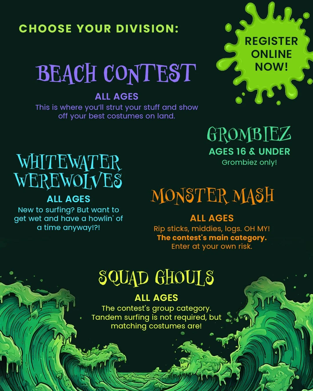 SQUAD GHOULS: The contest's group category. Tandem surfing is not required, but matching costumes are! Contestants will be expected to catch the same wave. All ages.